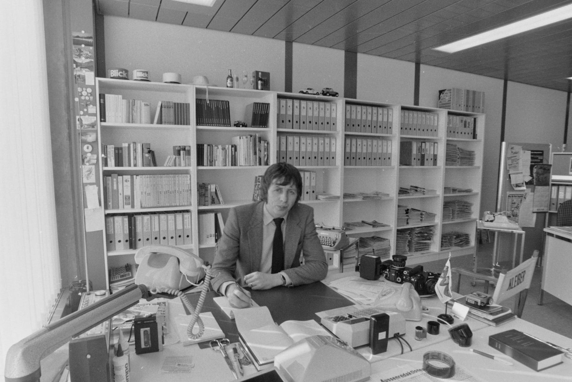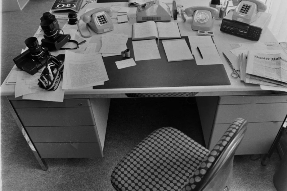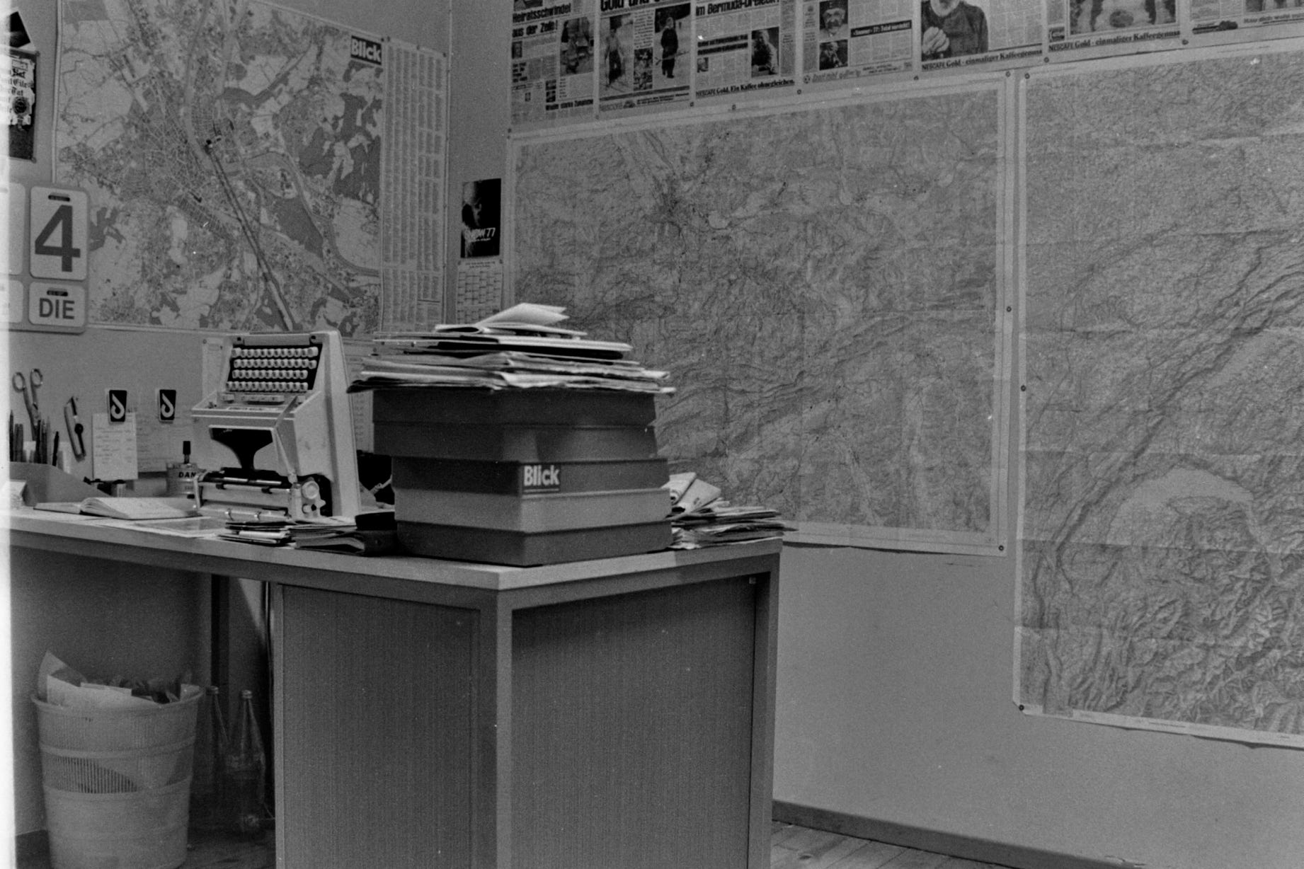 Blick-Büro 1976 – mit viel Papier, langen Telex-Streifen, Fotonegativen und Landkarten auf Papier. Auf dem Tisch läuft gerade das Bildfunk-Gerät zur Übertragung von Fotos per Telefonleitung…