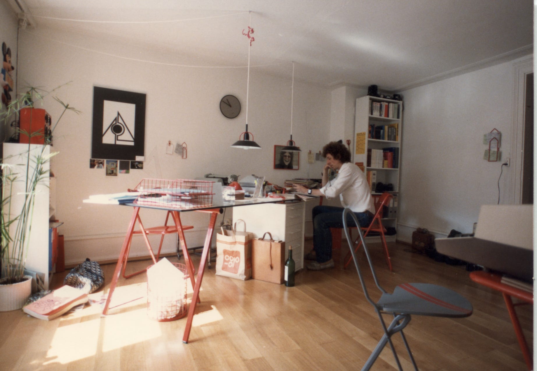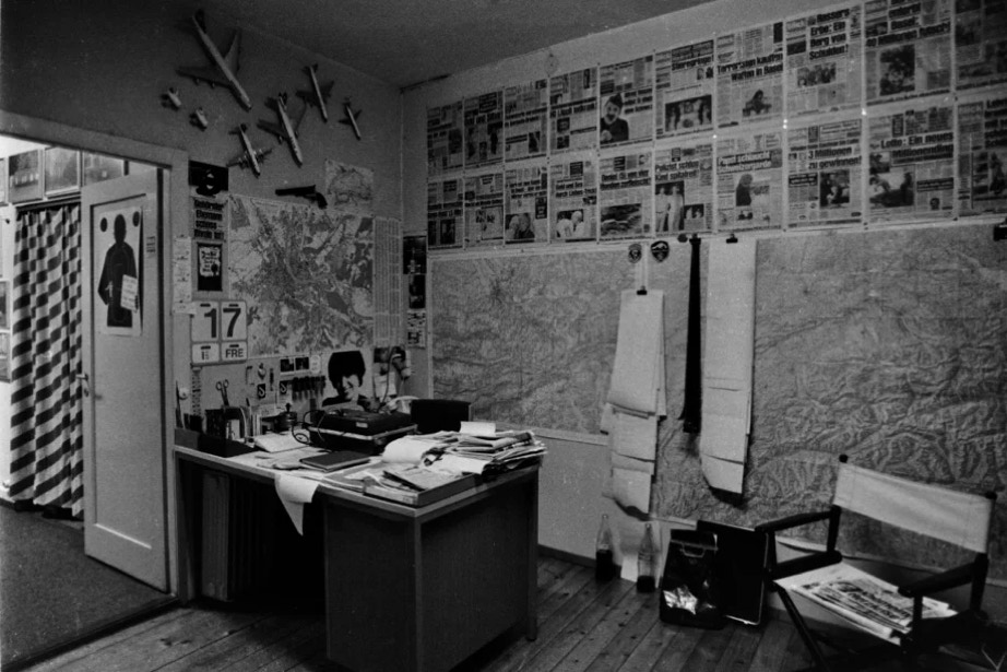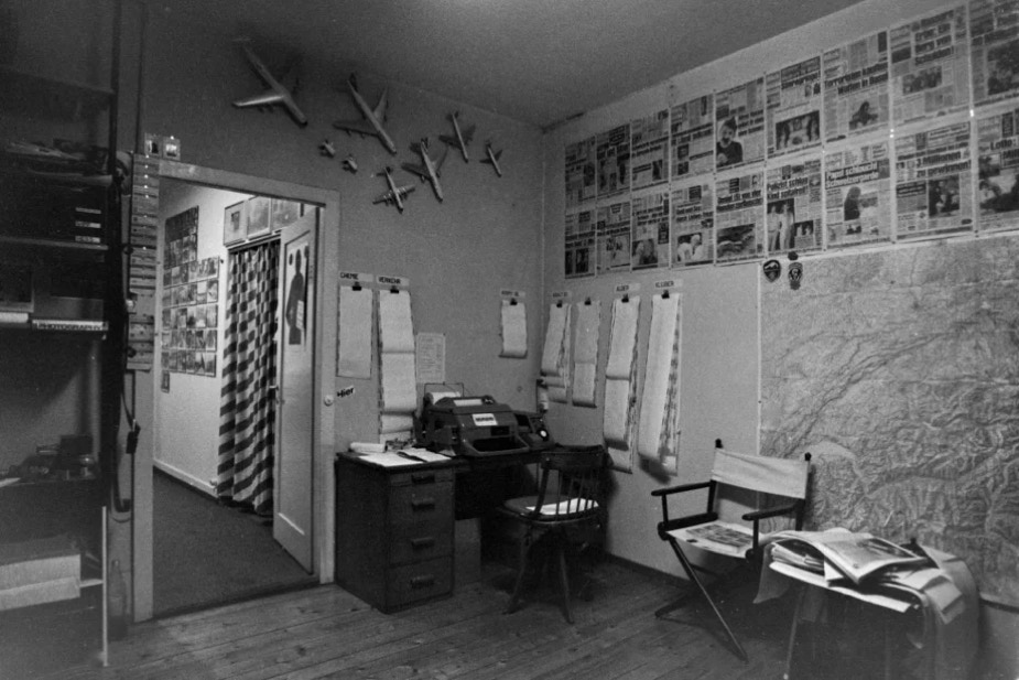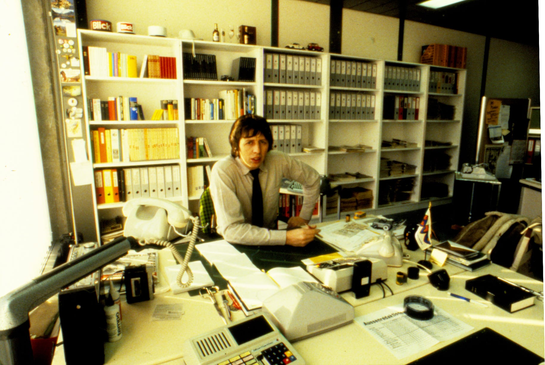 Blick-Büro 1976 – mit viel Papier, langen Telex-Streifen, Fotonegativen und Landkarten auf Papier. Auf dem Tisch läuft gerade das Bildfunk-Gerät zur Übertragung von Fotos per Telefonleitung…