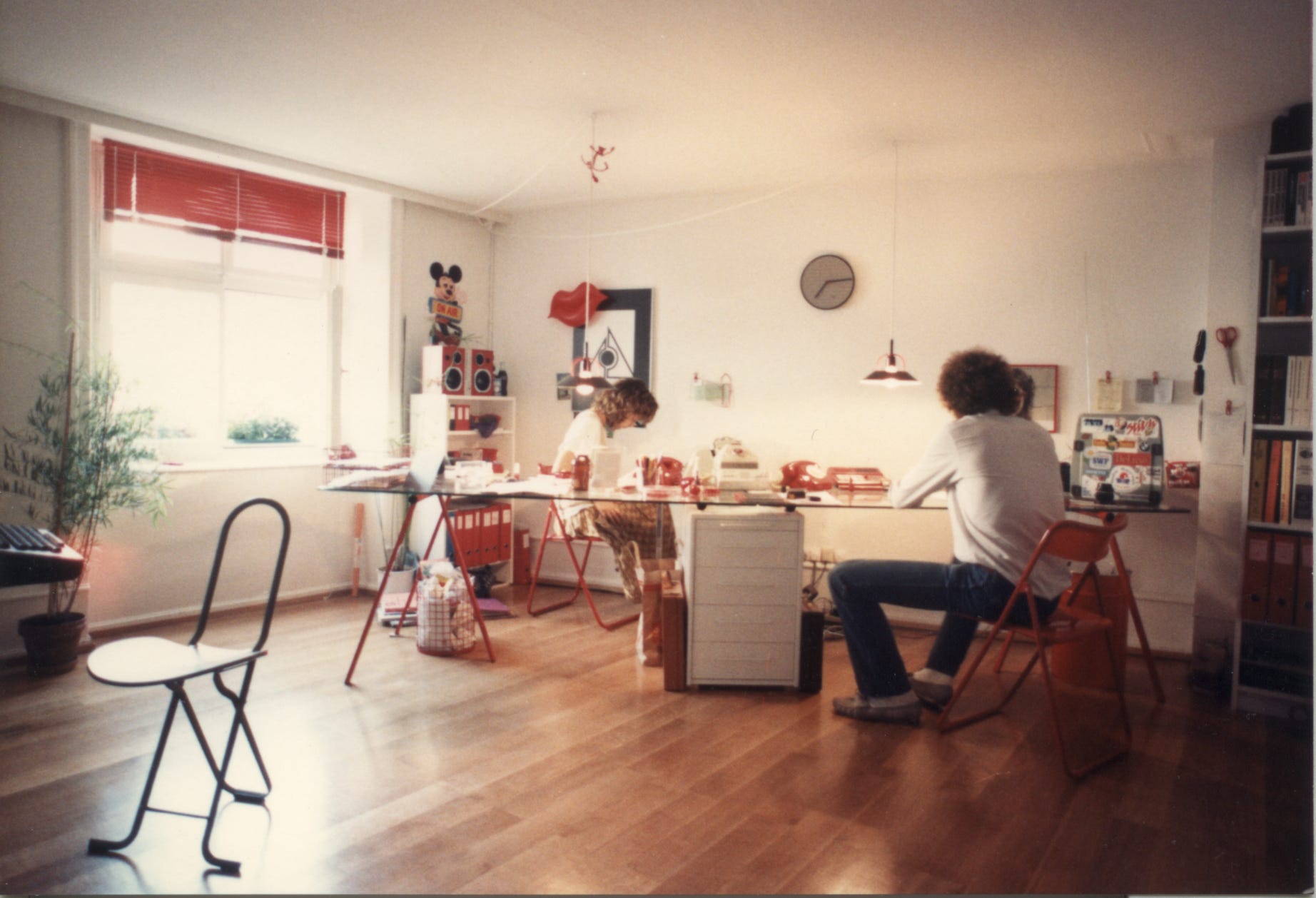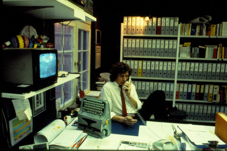Blick-Büro 1980 – die Wählscheiben-Telefone werden durch Tasten-Geräte abgelöst, das Konferenztelefon ist unverändert, der Polizeifunk-Scanner hat bereits das digitale Zeitalter erreicht…