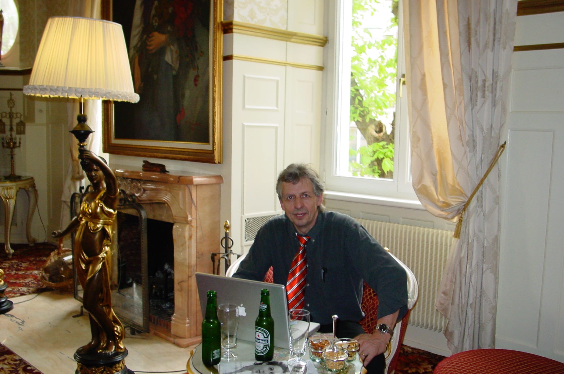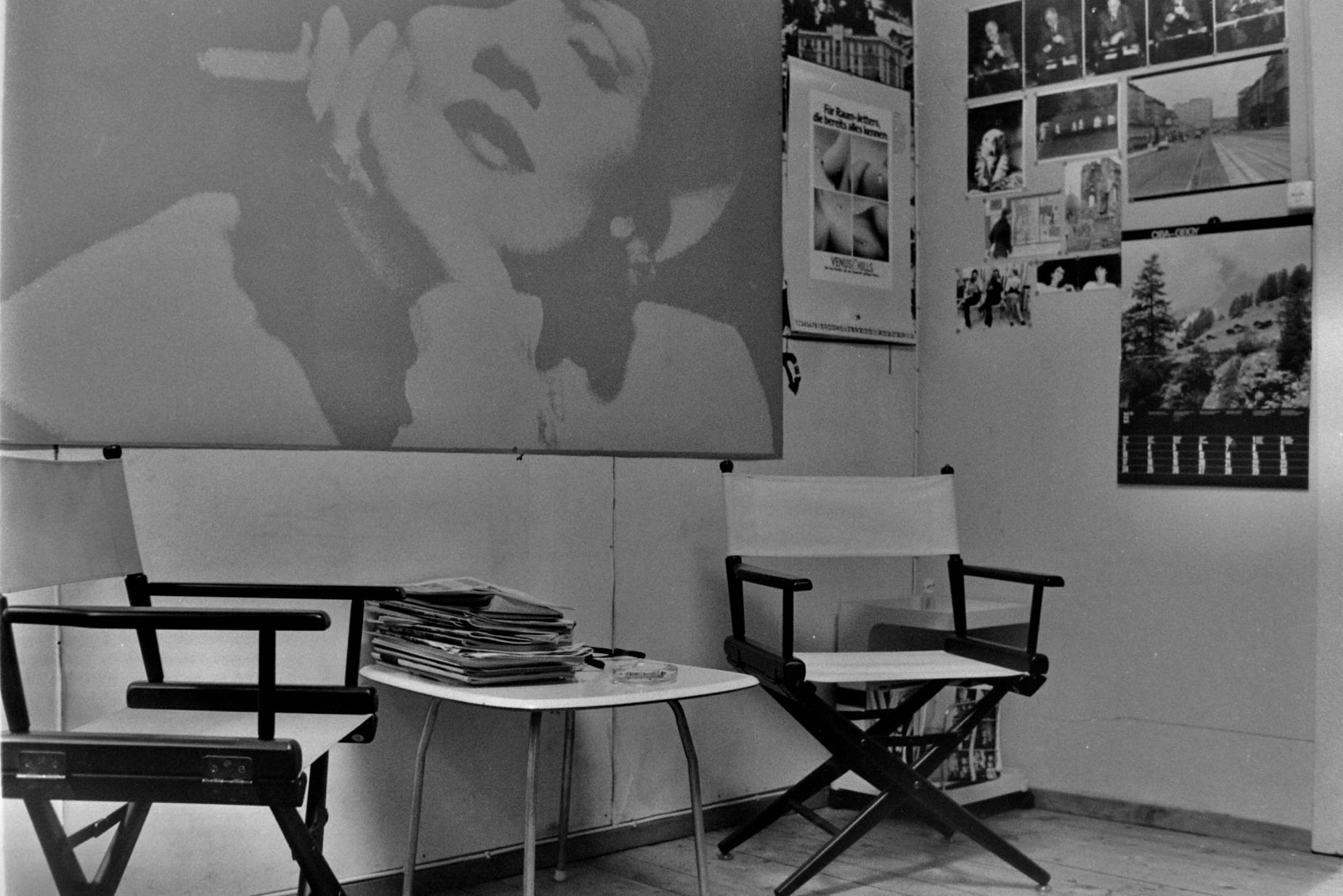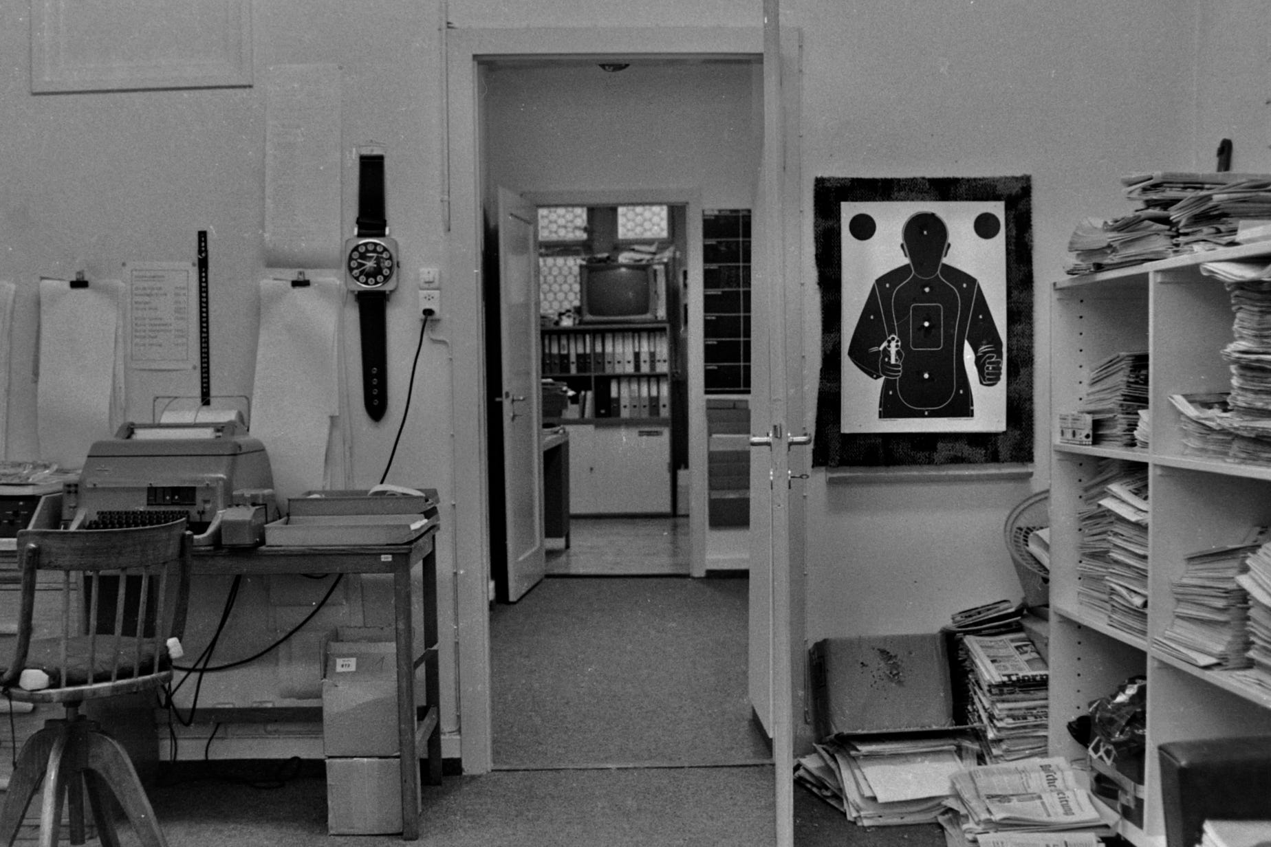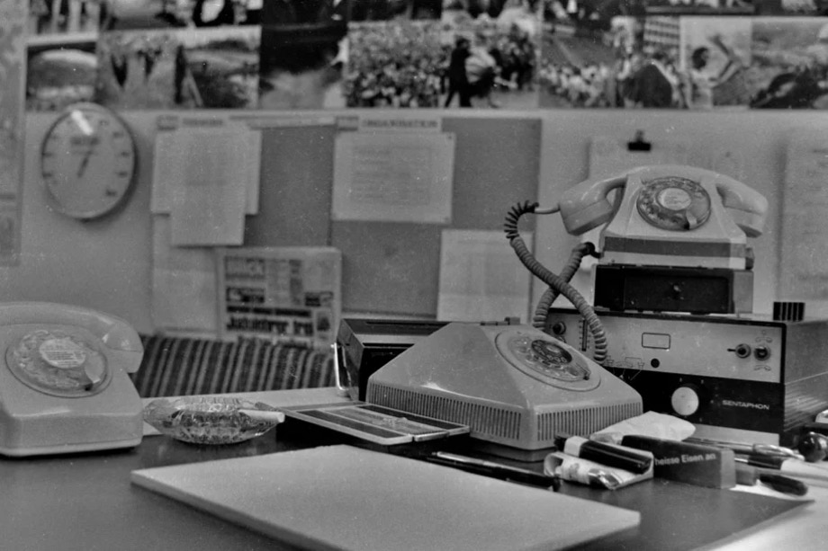 Blick-Büro 1976 – die Telefonapparate haben Wählscheiben, ebenso das unförmige Konferenztelefon, der Polizeifunk-Empfänger ist unförmig und lässt sich schlecht verbergen…